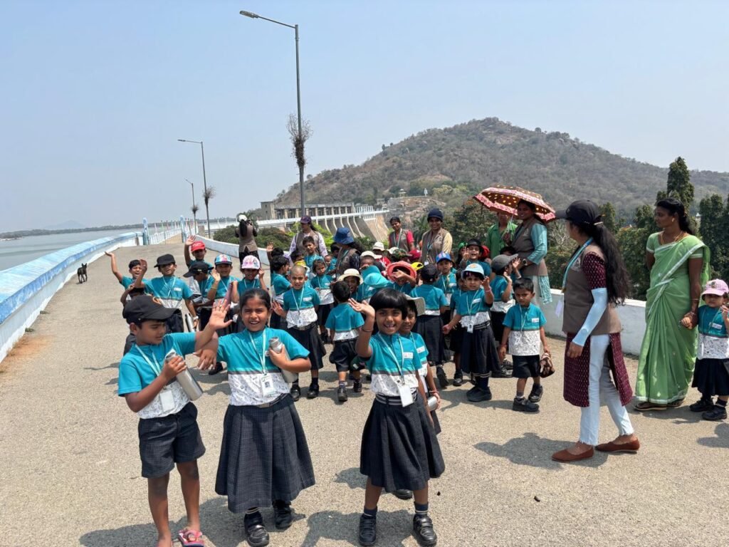 The students travelled to Sathanur Dam with their teachers and school staff. During the visit, they observed the large dam structure, the flowing water, and the surrounding natural environment. Teachers explained the importance of dams in storing water, supporting agriculture, and helping local communities.